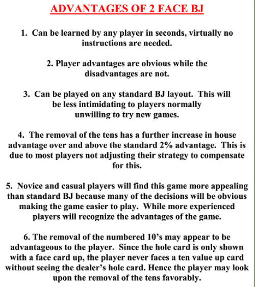 With the proliferation of 6 to 5 BJ games in many areas, 2 Face BJ would be a great option for many of the players looking for an alternative. While at the same time holding about as much as a 6 to 5 BJ game . It’s a WIN-WIN for both the players and the casinos!